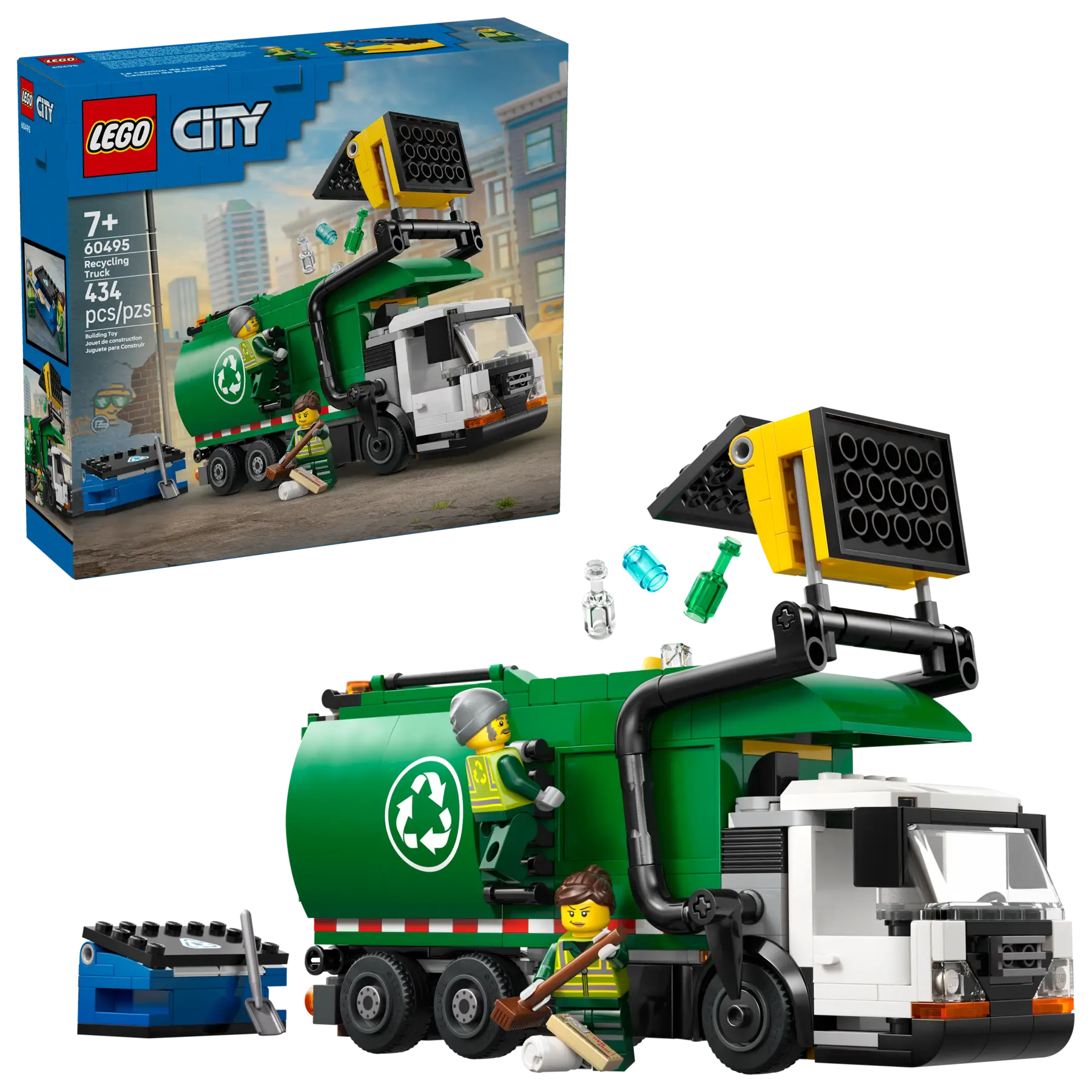 This LEGO® City Recycling Truck toy building set (60495) is packed with realistic details for imaginative play. The toy truck has a divider to sort the LEGO glass and paper elements, plus storage clips for tools and a detailed driver’s cab. Kids can tilt the cab to view the pretend electric motor, push a lever to lift and empty the 2 dumpsters into the truck and raise the container to tip the sorted waste through either of the 2 rear hatches. Just add the driver and worker minifigures and let the adventures begin. This detailed kids’ model truck kit makes a great gift for 7-year-old boys and girls who love hands-on interactive toys for creative play. Add it to other LEGO City sets (sold separately) for more adventures. With this LEGO Recycling Truck playset, kids can enjoy intuitive building with the LEGO Builder app, zooming and rotating with 3D instructions while saving and tracking progress as they build – all from the app. Set contains 434 pieces.