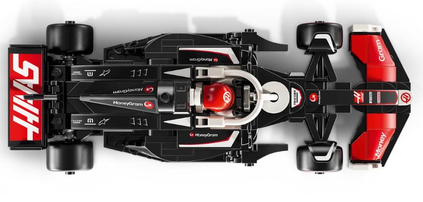 The F1 model car features a cockpit that opens by lifting the halo bar, a rear wing, wishbone suspension, sponsor stickers and wider rear tires imprinted with “Pirelli.” The F1 race car also comes with a driver minifigure wearing a MoneyGram Haas F1 Team outfit and a winged helmet to place inside the cockpit.