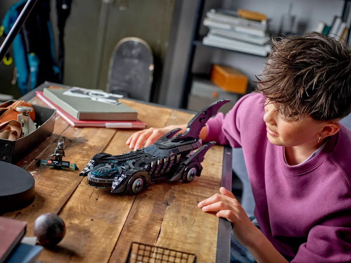 This authentic recreation of the iconic car from the Batman Forever film features a moulded windscreen, moving wheels, decorations and a cockpit that opens to reveal a detailed interior. The vehicle also come with a Batman minifigure with its own special stand. For added digital fun, builders can zoom in, rotate models in 3D and track their progress using the intuitive LEGO Builder app. Contains 909 pieces.