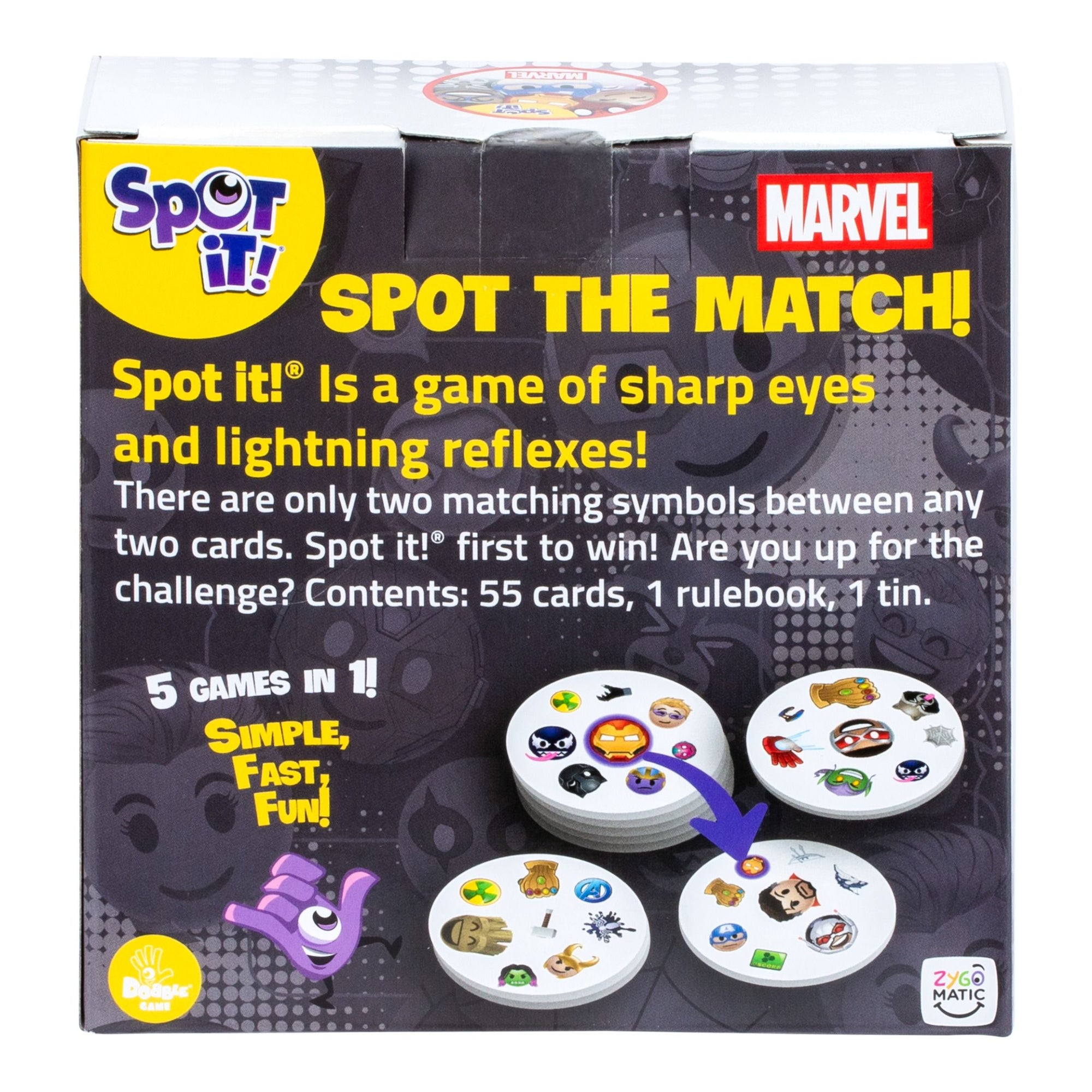 - Marvel Edition! Spot It! has expanded its line-up with an exciting Marvel edition. This game offers a unique twist on the classic matching mechanics, with some of your favourite Marvel Characters like Iron Man, Captain America, Cosmic Cube and more.