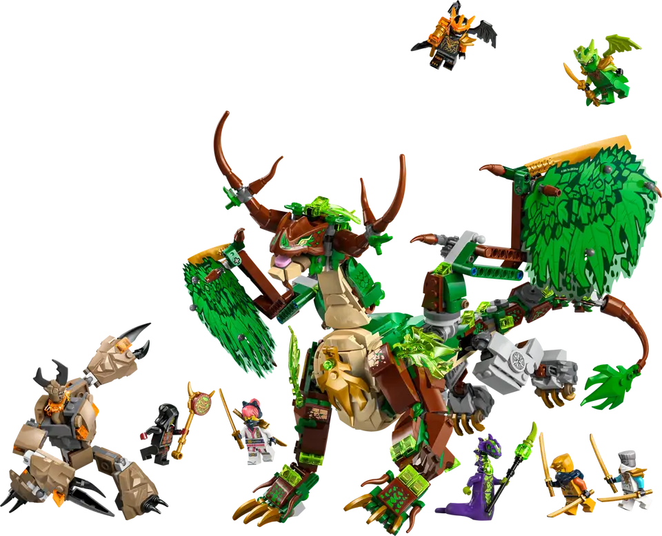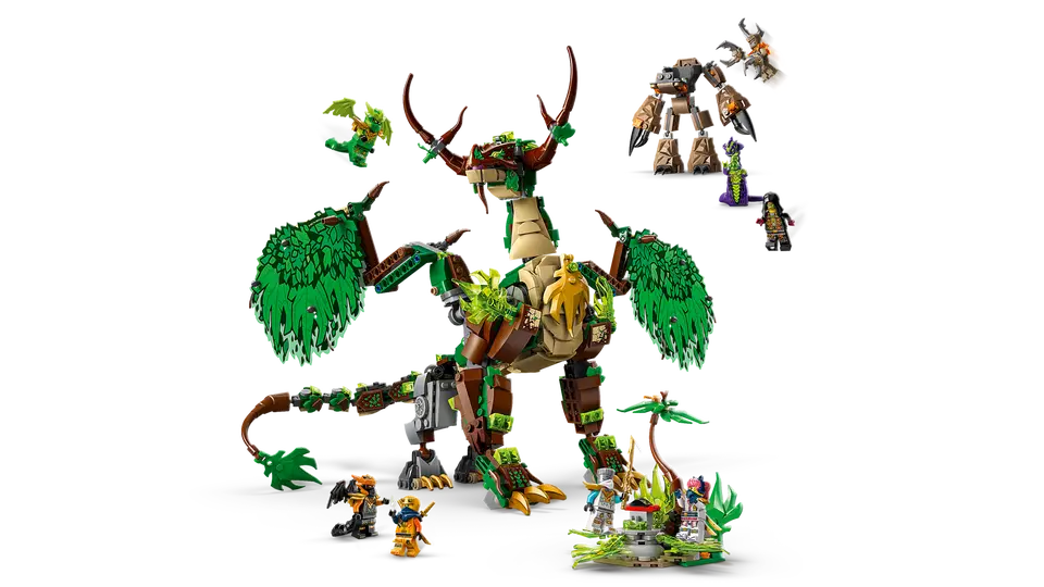 Boys and girls ages 9 plus will be thrilled to build this LEGO® NINJAGO® The Dragon of Life (71859) ninja toy before recreating scenes from season 4 of the NINJAGO Dragons Rising TV show. This dragon toy can spread its wings out wide or tuck them in, and it has a posable jaw, head, neck, legs, ankles, claws, tail and a saddle for a minifigure. The playset includes a side build with a tree and a plant kids can spin around that hides a golden sword accessory, plus a posable mini mech toy with a cockpit for a minifigure. To role-play epic battles, there are 8 minifigures: ninja Zane, Sora, Arin, dragon form Lloyd and dragon form Cole and the villainous trio of Acid Monster, Earth Monster and Loyalist Leader. LEGO NINJAGO sets let ninja fans escape into a fantasy world for imaginative play with their ninja heroes. Kids can build each playset with confidence using the LEGO Builder app – zoom, rotate in 3D and track progress with easy-to-follow digital instructions. Set contains 1,050 pieces .