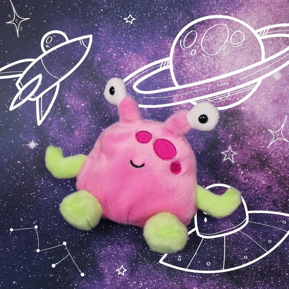 Silly Alien is an adorable plush with a rosy pink body and contrasting lime green limbs. His big, wobbly eyes and a constant grin complement his eccentric personality, while textured spots give him an extraterrestrial charm.