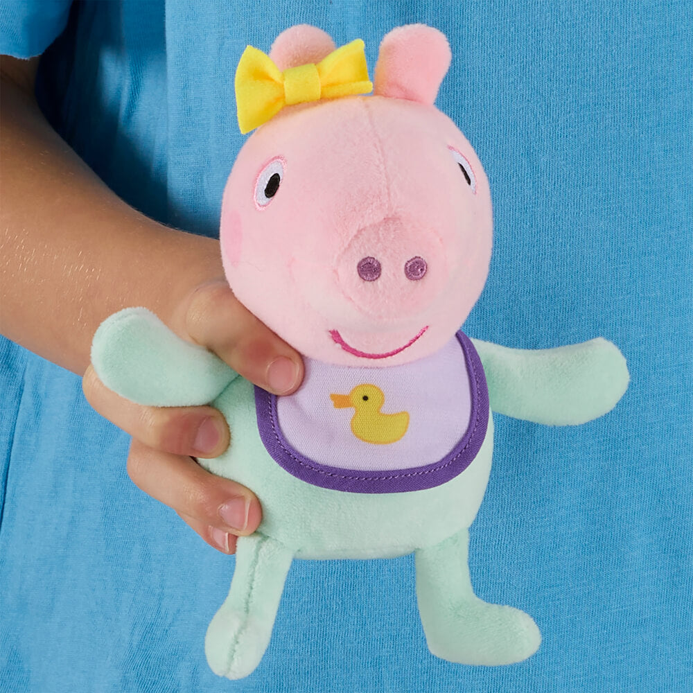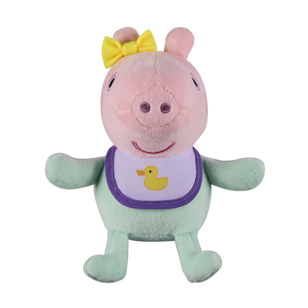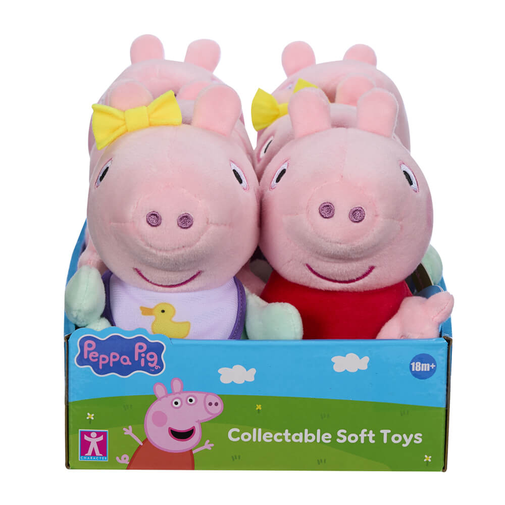 Super soft Peppa, George and Evie plush toys measuring approximately15cm tall. Cute and cuddly, these are the perfect size for young Peppa Pig fans to take with them when out and about. Featuring classic Peppa Pig styling, these toys will delight preschoolers and fans of the show! Presented in a counter display unit of 6 pieces. Assortment includes 3x Peppa, 1x George and 2x Baby Evie. Suitable for 18 months+.