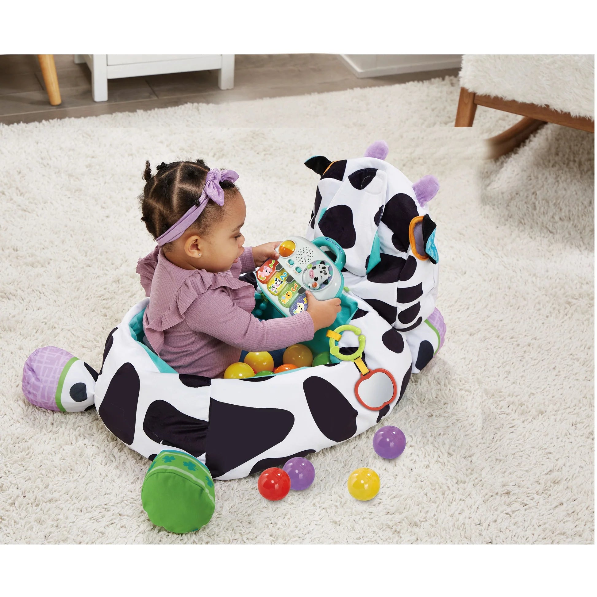 Fun and exciting, this cute animal buddy includes a self-discovery apple mirror, textured carrot, interactive piano and 30 multi-coloured balls. Grab the detachable piano and set up a moosical concert anywhere! Switch between three modes to play piano notes, animal sounds, and hear fun learning phrases with each light up key. Explore textures by interacting with the squeaky horns, crinkly ears and soft body of the cow, creating a fantastic playtime experience that will grow with your child.