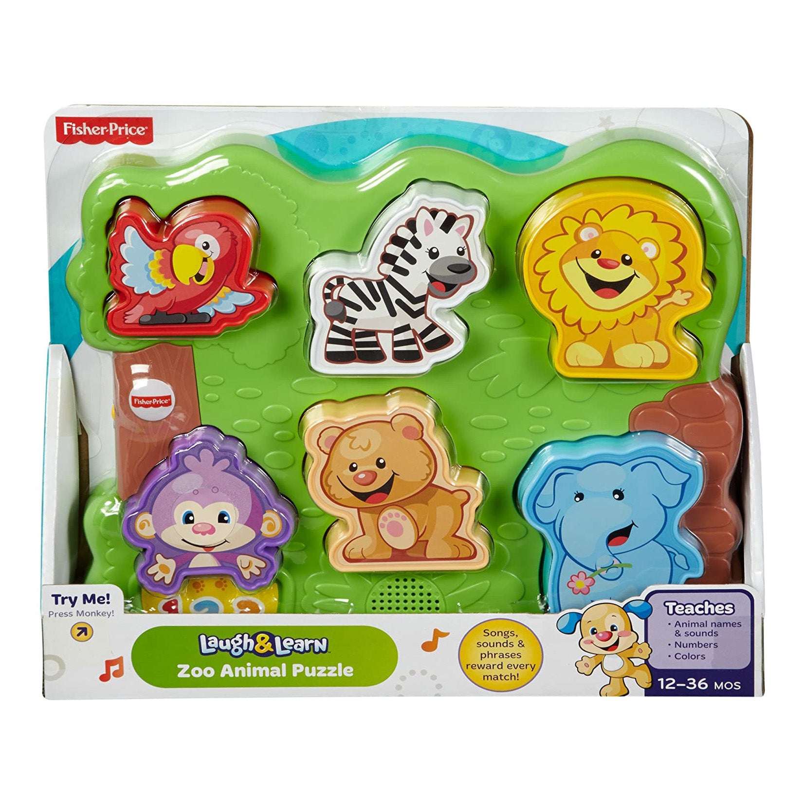 Monkey wants to introduce your baby to the animals in the zoo! When Baby fits each animal puzzle piece into place, they hear a song with that animal’s name and sound! They can also press Monkey’s button for a counting song, a zoo song and fun phrases like "What’s your favourite animal?"