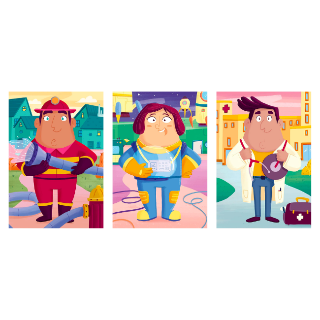 This set of 3 24-piece puzzles depicts people working in different professions – an Astronauts, a Doctor and a Firefighter. The cleverly cut puzzle pieces can be mixed up, so you can build different characters. Just imagine the head of the Astronaut, the body of the Doctor and the feet of the Firefighter